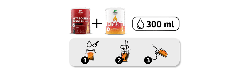 Mix 5 g (1 scoop) Metabolism Booster Extreme and 5 g (1 scoop) Ok!Fatburn together in 300 ml of water, stir and drink.