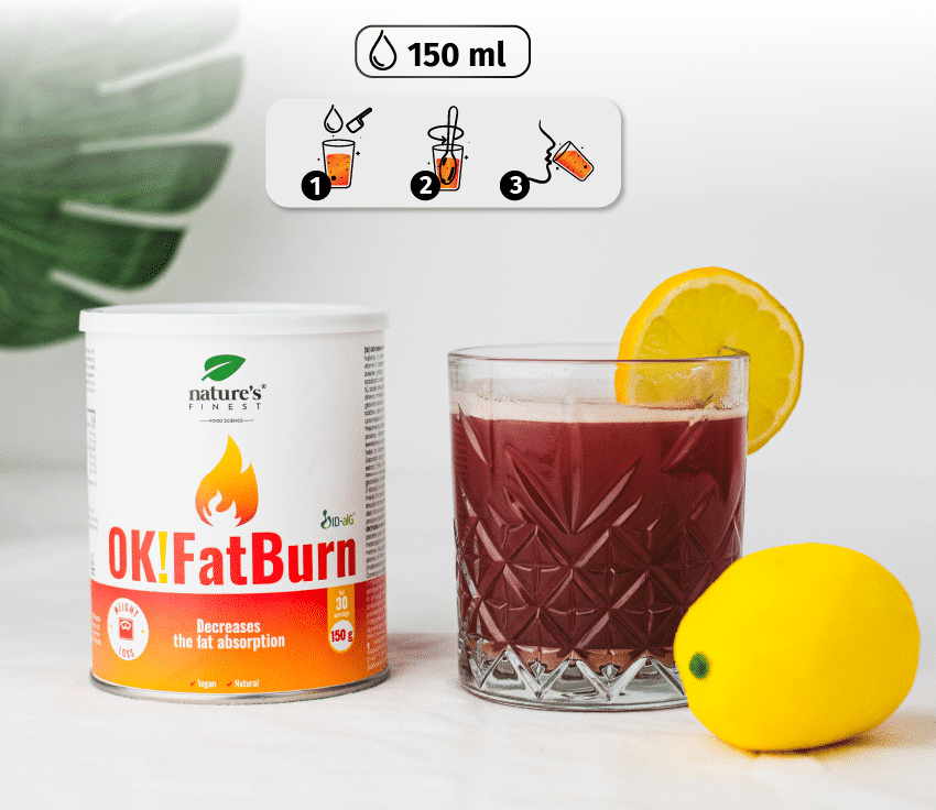 ÎNAINTE DE CINE: 5 g (1 lingură) Ok!Fatburn, amestecați în 150 ml apă și beți.