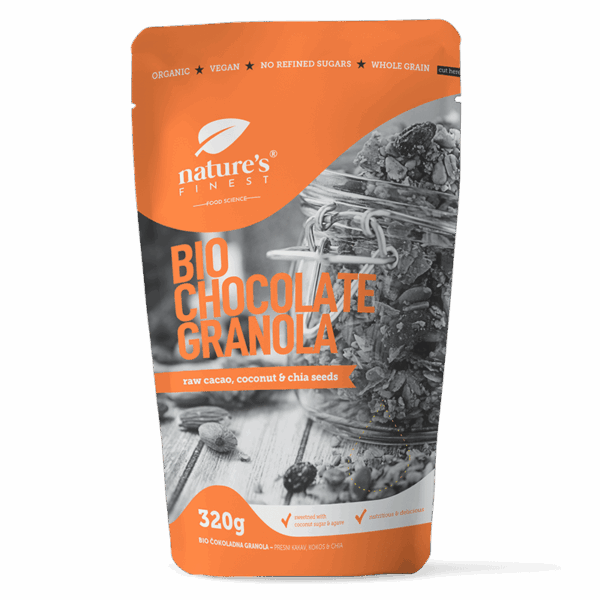 Ingrediente: Fulgi de ovăz (avena sativa)* (54%), pudră de cacao (Theobroma cacao)* (8%), ulei de cocos extra virgin (cocos nucifera)* (8%), sirop de agave (agave americana)* ( 8%), zahăr din nucă de cocos (cocos nucifera)* (7%), fulgi de nucă de cocos (cocos nucifera)* (6%), ciocolată neagră cu 70% cacao (Theobroma cacao)* (5%), semințe de chia (salvia hispanica )* (2%), migdale (prunus dulcis)* (2%)* (2%)*. *Organic.