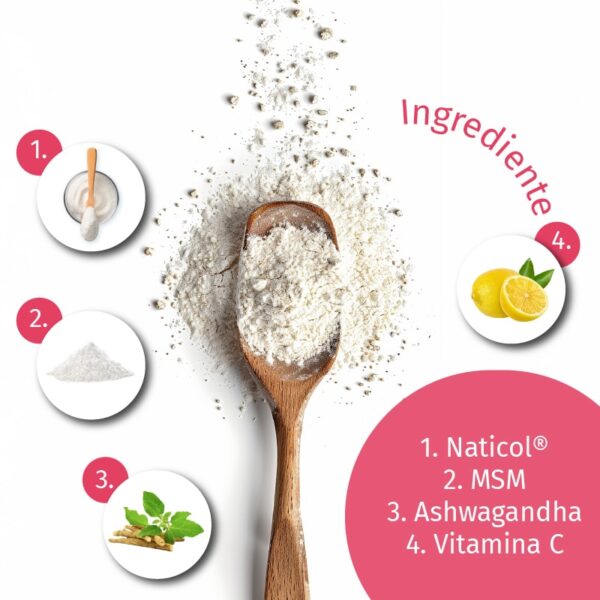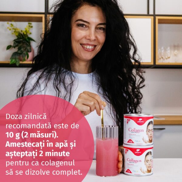 Doza zilnică recomandată este de 10 g (2 măsuri). Amestecați în apă și așteptați 2 minute pentru ca colagenul să se dizolve complet. Cu 10 g de pulbere, consumați 5 g de peptide de colagen Naticol.
