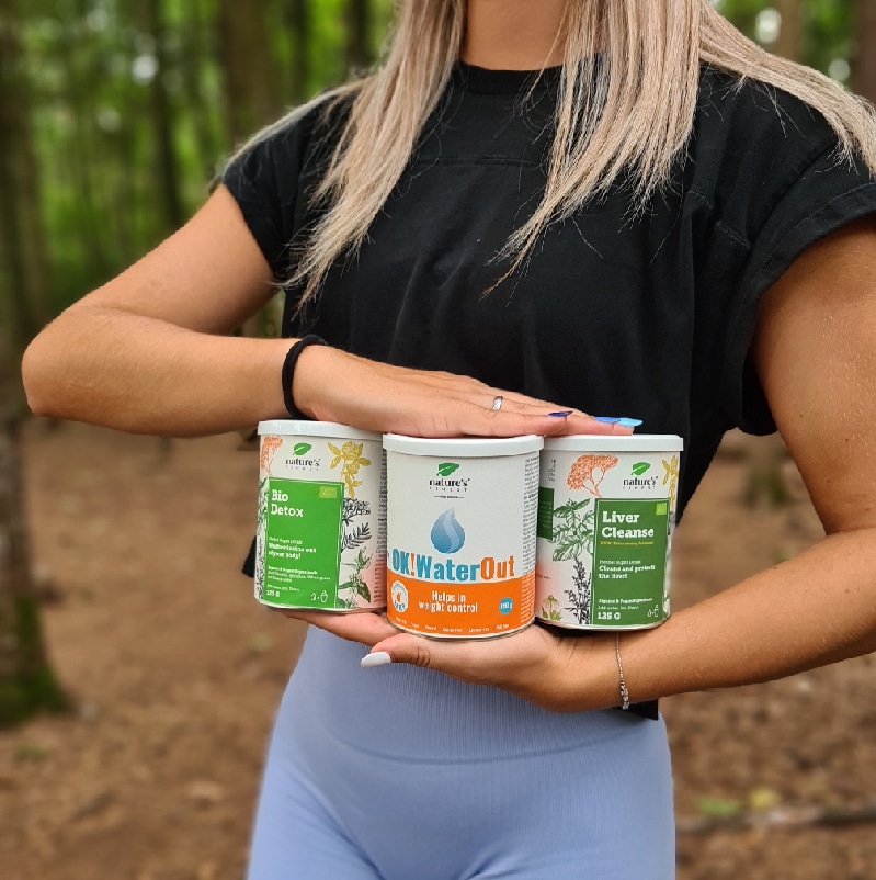 OK!WaterOut: urzică, soc, troscot. Liver Cleanse: armurariu, turmeric, anghinare. Bio Detox: iarbă de grâu, spirulină, chlorella, orz, lucuma.