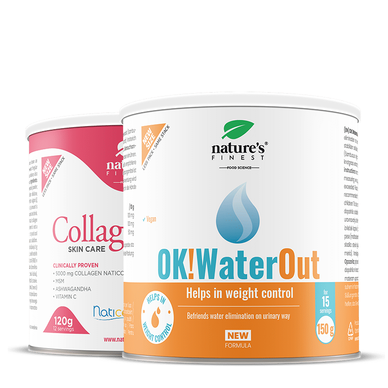 În primele 15 zile, amestecați dimineața, într-un pahar cu apă, 2 linguri (10 g) de OK!WaterOut băutură cu aromă de ananas. Apoi, pentru următoarele 12 zile, amestecați 2 linguri (10 g) de SkinCare Collagen într-un pahar de apă după-amiaza sau seara, lăsați 2 minute pentru ca colagenul să se dizolve complet și beți. Băutura are un gust plăcut de căpșuni. Cu 10 g de pulbere consumați 5 g de peptide de colagen Naticol.