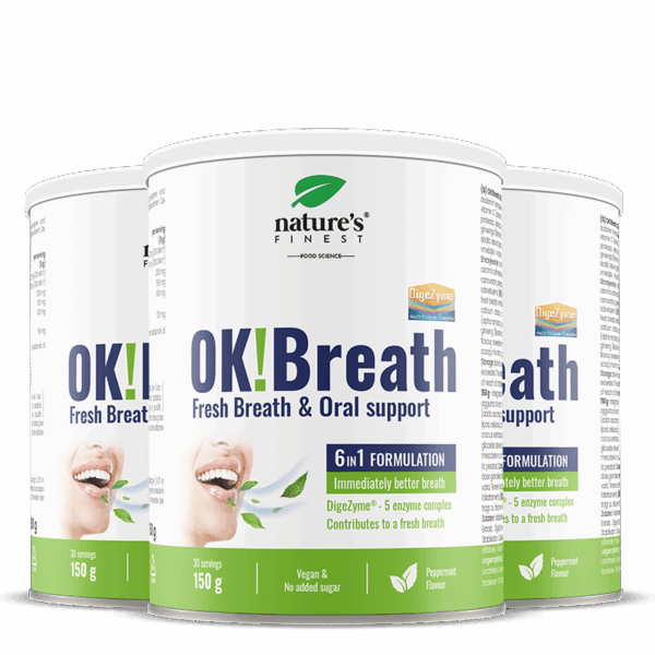 OK!Breath combină un amestec de 6 ingrediente eficiente cu un complex patentat DigeZyme® care conține cinci enzime digestive care ajută la remedierea respirației urât mirositoare de la sursă.