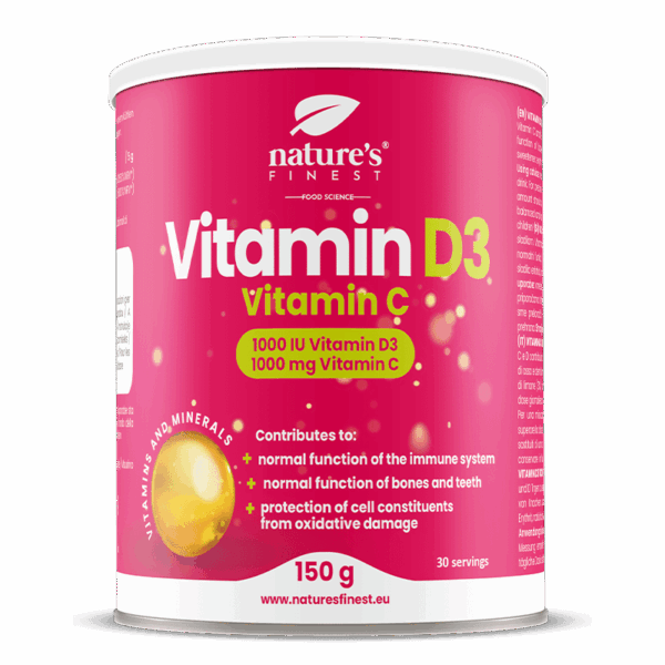 Cu această pulbere de vitamina D3 și vitamina C, asigurăm cea mai bună absorbție, care începe imediat ce este consumată. Rolul principal al vitaminei D este de a menține homeostazia și o concentrație constantă de calciu și fosfați în plasmă, iar vitamina C acționează ca un puternic antioxidant.